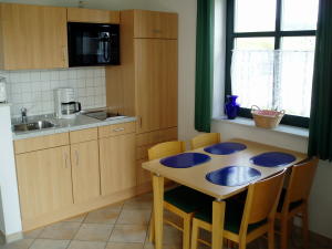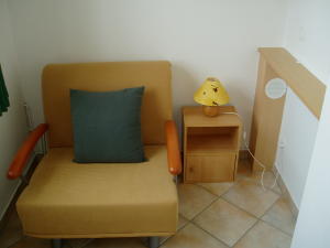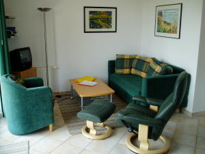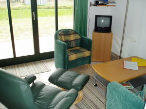 - Schlafzimmer mit Doppelbett, Nachtische, großem Kleiderschrank, Radiowecker - Kinder-/ Gästezimmer mit einem 200cm-Schlafsessel, Klapptisch - Küche-/ Wohnbereich mit gut ausgestatteter Küche, Geschirrspülmaschine, Esstisch mit 4 Stühlen, Schlafcouch mit Tisch, Relax-Sessel, Radio/CD-Player und TV, Spielesammlung und kl. Bibliothek - Terrasse mit Gartentisch und 4 Stühlen sowie 2 Liegesessel - Badezimmer mit Toilette und Dusche